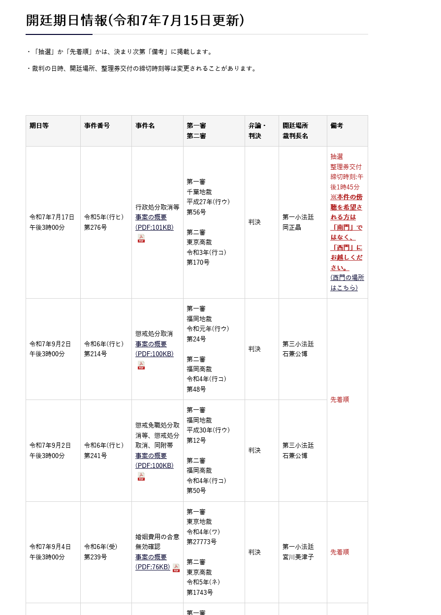 2025/07/15時点で、最高裁判所開廷期日情報は以下であった。